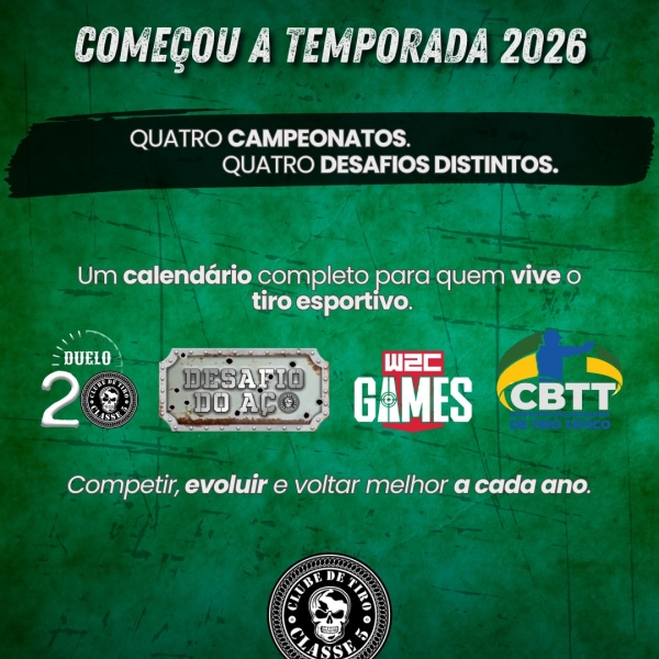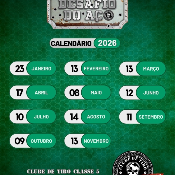 DESAFIO DO AÇO CLUBE DE TIRO CLASSE 5 –  2026 Datas: 2º sexta feira de cada mês. A partir das 18hs. Atenção: Nos dias do